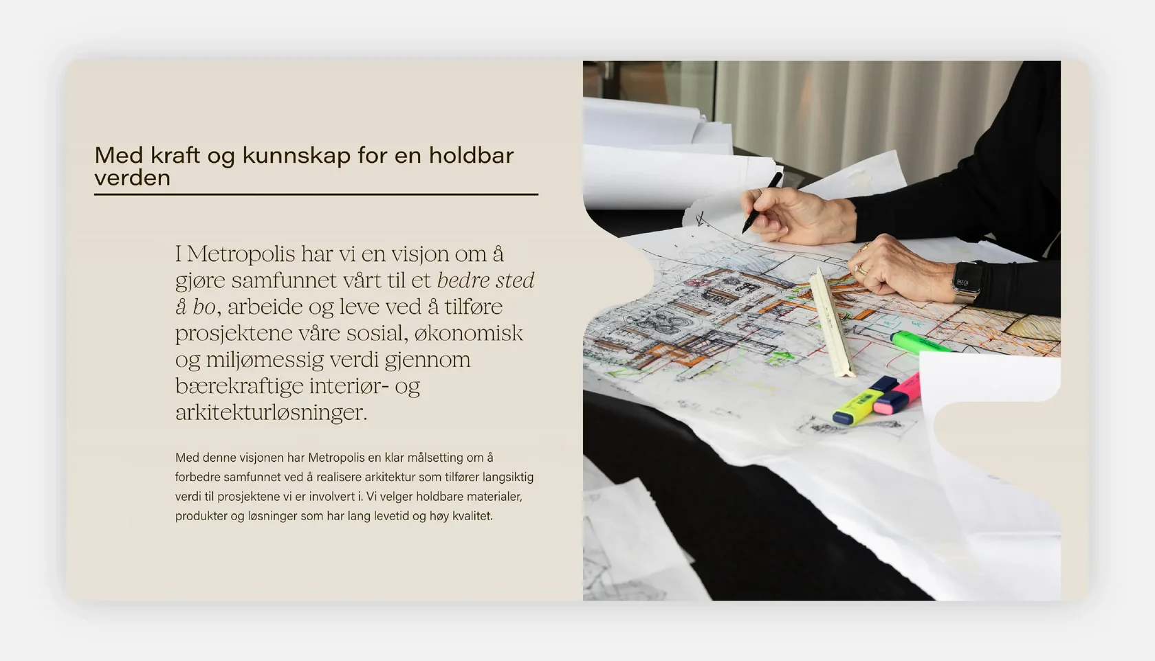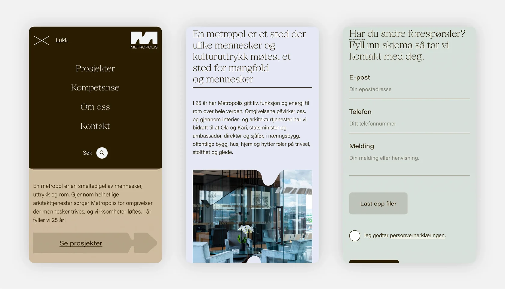 The choice of SFT Schrifted Serif enhances Metropolis’s visual identity with a typeface that feels grounded and articulate. Its soft shapes and dynamic details mirror the human-centered ethos of the studio, while maintaining the architectural clarity needed in a professional setting. Paired with a modern sans, it balances expressiveness and function — a typographic reflection of Metropolis’s dual focus on aesthetics and livability.